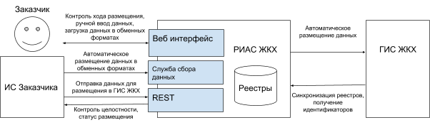 Как видно из схемы, API можно использовать как с помощью обменных форматов (через службу сбора данных), так и с помощью веб-методов. Через веб-интерфейс Заказчик может работать с данными первичных реестров, загружать сведения в обменных форматах и/или контролировать ход автоматического размещения данных в ГИС ЖКХ.